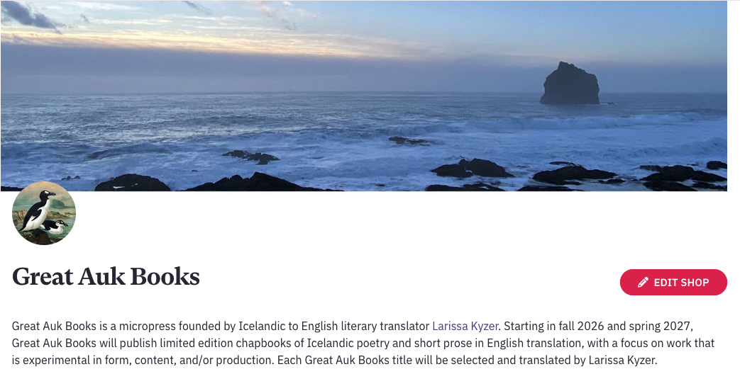 To this end, I’ve registered a ‘store’ with curated book lists on Bookshop.org via their affiliate program. As an affiliate, I will get 10% of the list price on any book sold from that page, funds I will put directly towards the production of Great Auk Books titles. This won’t be my only source of fundraising, of course, but it’s a nice and relatively painless way of generating a little bit of revenue, and it also allows some scope for my readerly imagination. Also a librarian by training and trade, I love to make book recommendations, particularly of Icelandic literature in English translation or literature in translation more broadly, but also of English language poetry, contemporary fiction, (Nordic) crime novels, romance novels—you name it. I read very broadly!